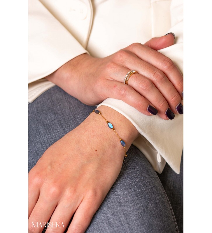 Ova elegantna narukvica izrađena je od visokokvalitetnog nehrđajućeg čelika i ukrašena prekrasnim plavim kamenjem koje reflektira svjetlost pri svakom pokretu. Nježan, ali upečatljiv dizajn čini je savršenim dodatkom za svaki outfit – od svakodnevnih kombinacija do posebnih prilika. Simbolizira mir, harmoniju i sofisticiranost, a plavi tonovi dodaju dozu elegancije.